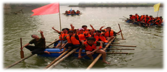 1.在规定时间内,使用所给材料扎成能容纳所有队员的竹筏,安全划到目的地后返回。